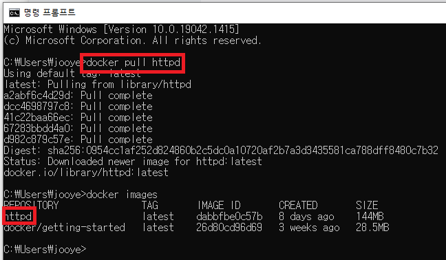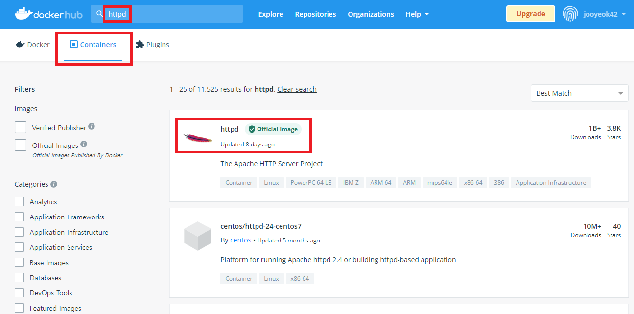 - 필자는 Apache가 포함되어 있는 httpd 컨테이너를 선택했다.