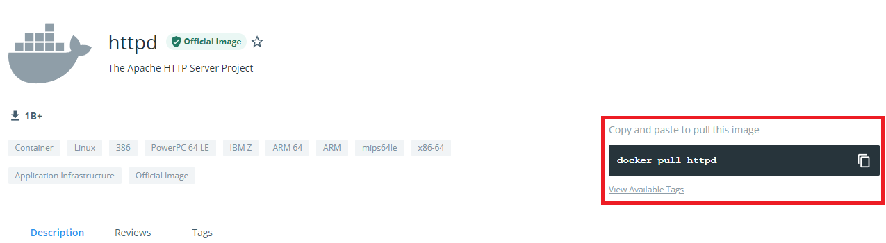 - 컨테이너를 선택하면 Image를 pull할 수 있는 명령어를 알려주기 때문에, 쉽게 원하는 Image를 다운받을 수 있다.