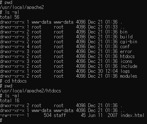 - pwd 명령어는 현재 디렉토리의 위치를 표시한다. 기본 위치는 /usr/local/apache2 임을 알 수 있다.
