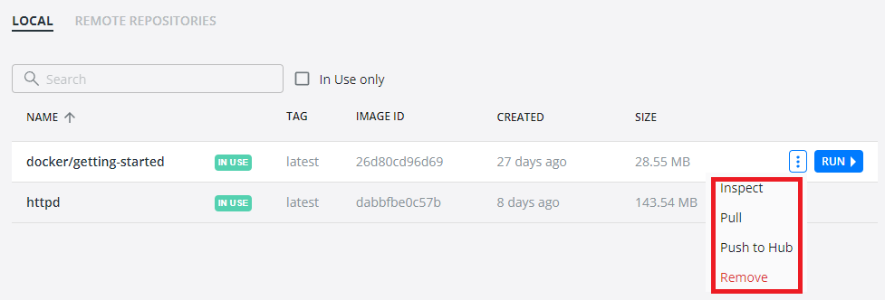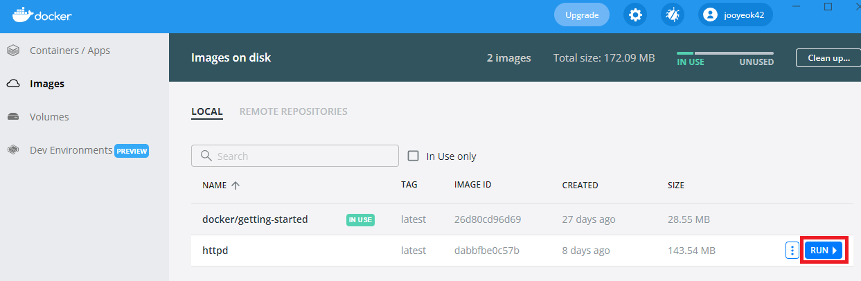 - 여러분이 설치한 Image에 커서를 놀리면 우측에 [RUN] 버튼이 생긴다. 이 버튼을 클릭한다.