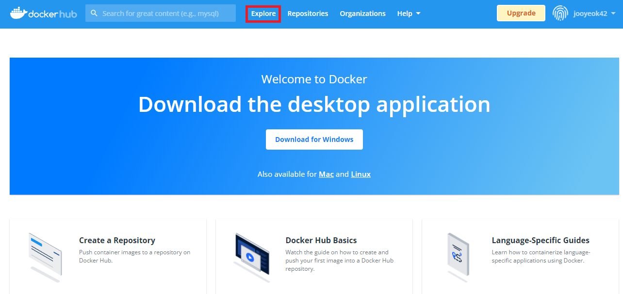 - 먼저, https://hub.docker.com/ 에서 Explore에 들어간다.