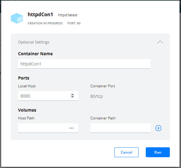 docker run --name httpdCon1 -p 8080:80 httpd