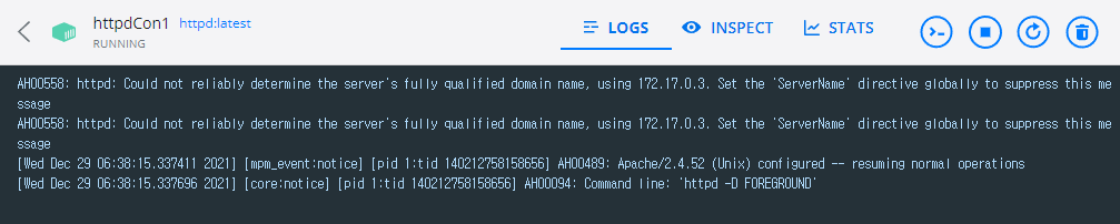 - 컨테이너를 누르면 로그, 상세 정보, 통계 정보를 확인할 수 있고, 아이콘을 통해 중지, 재시작, 삭제를 진행할 수도 있다.