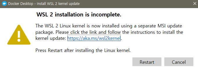 WSL 2 installation is incomplete, 윈도우10 도커 설치시 리눅스 커널 업데이트, Docker Linux Kernel Update on Wind