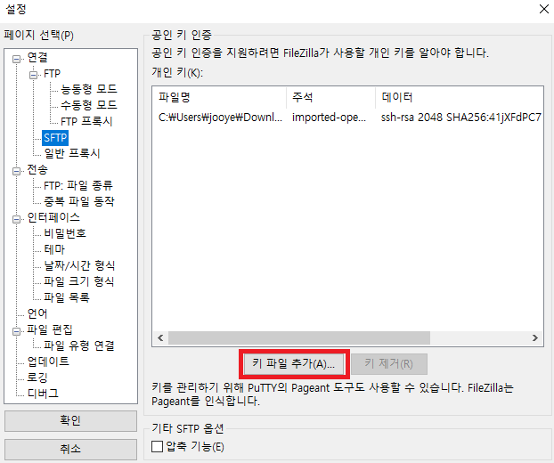- 상단 메뉴의 [편집 ]-> [설정]에서 SFTP에 여러분들이 EC2 인스턴스를 생성했을 때 발급 받았던 key pem 파일을 추가한다.
