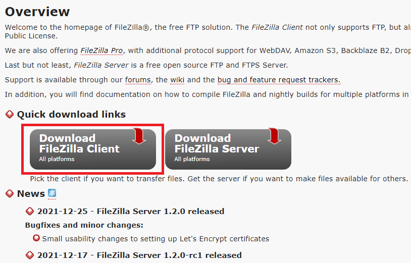 - 아래 링크에서 FileZilla Client를 설치한다.