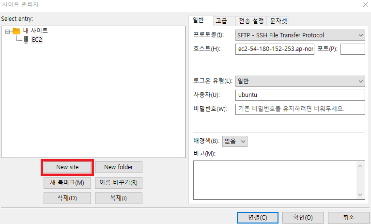- 상단 메뉴의 [파일] -> [사이트 관리자]에서 원격 서버에 대한 엔트리를 추가한다.