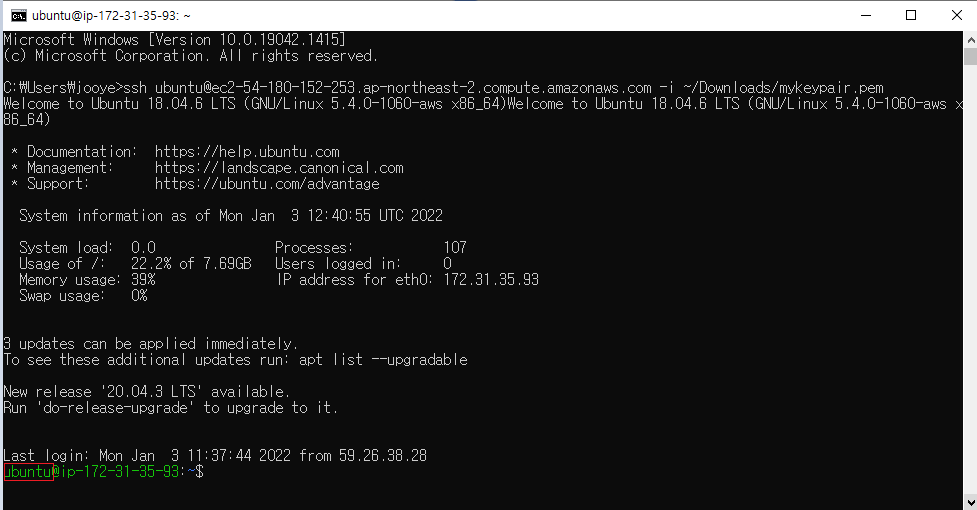참고로, 사용자명은 여러분들이 원격으로 EC2 컴퓨터에 접속했을 때 나타나는 유저 정보의 '@'의 왼쪽 부분이다.