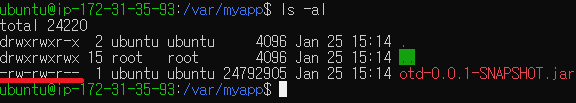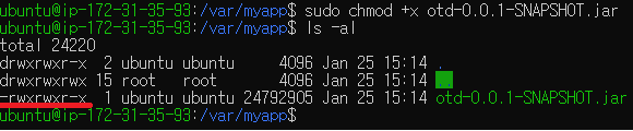 - /var/myapp에 있는 executable jar file의 접근 권한을 보니 실행(x) 권한은 없는 상태이다.