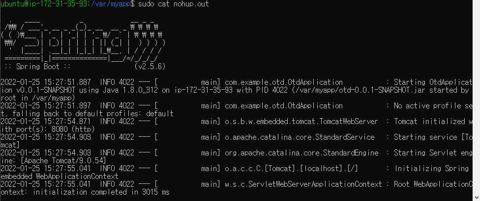 - "sudo cat nohup.out" 명령을 통해서 웹 애플리케이션의 로그를 확인할 수 있다. 정말 익숙한 로그가 출력되었다.