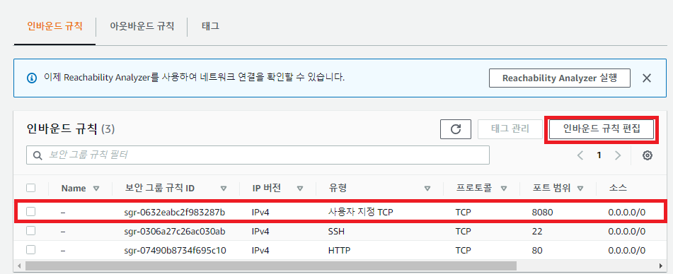 - 하단에 있는 인바운드 규칙 메뉴에서 [인바운드 규칙 편집]을 통해서, 아래와 같이 웹 애플리케이션에 대한 포트를 추가해주면 배포 작업은 끝난다. 0.0.0.0/0은 모든 외부 접속을 허용하는 특수 주소이다.