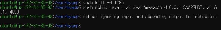 ※ nohup : 터미널 세션이 끊겨도 실행을 유지하도록 하는 프로그램