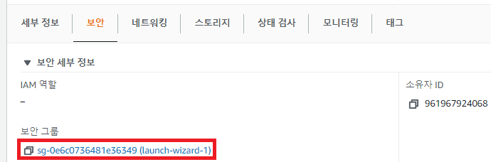 - 먼저, 여러분이 생성한 EC2 인스턴스의 보안 메뉴에서 보안 그룹에 들어간다.