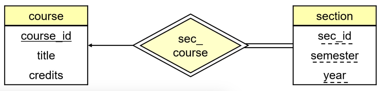 - relationship을 만들지 않아도 되고, strong entity set의 key를 포함한다.