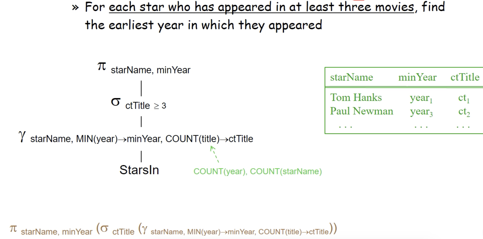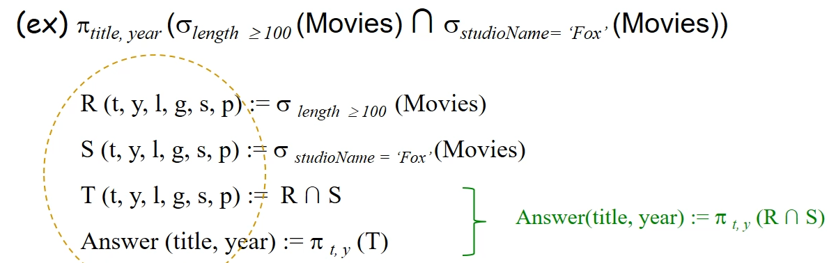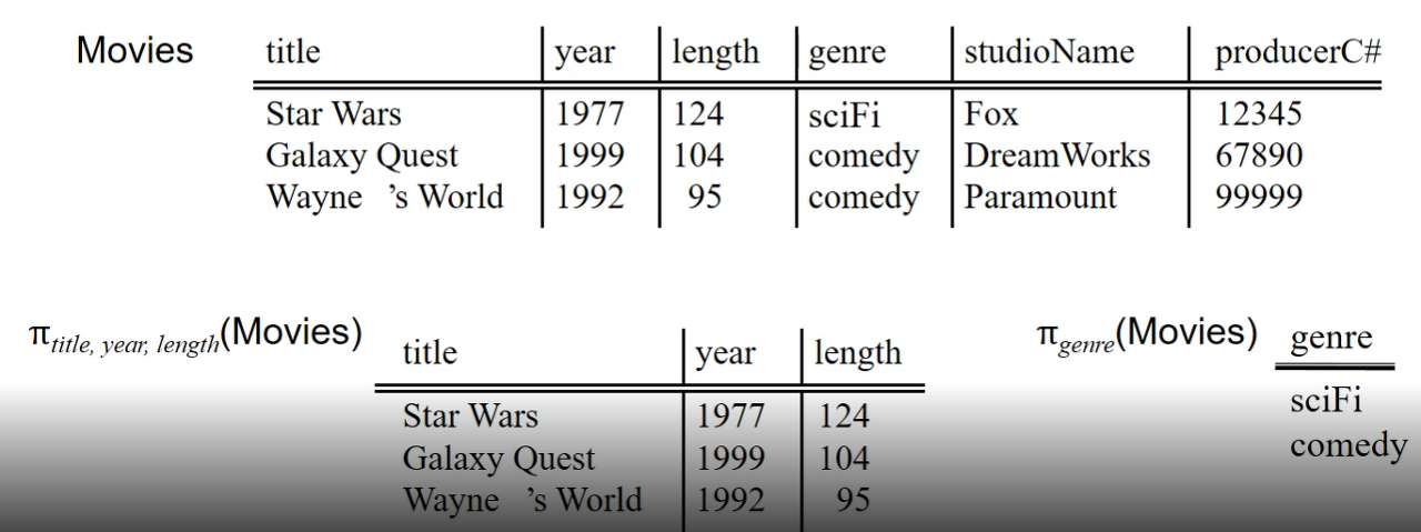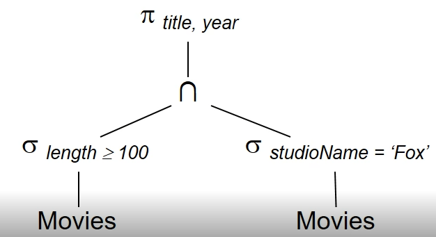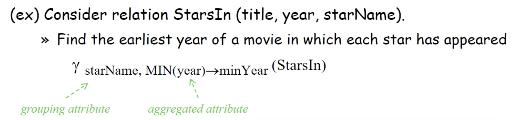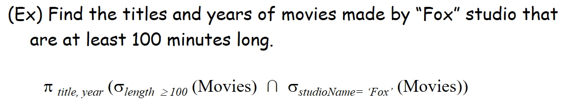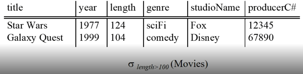 - γL(R) 로 표기 -> 예) γ studioName, SUM(length)->lengthSum (Movies)
