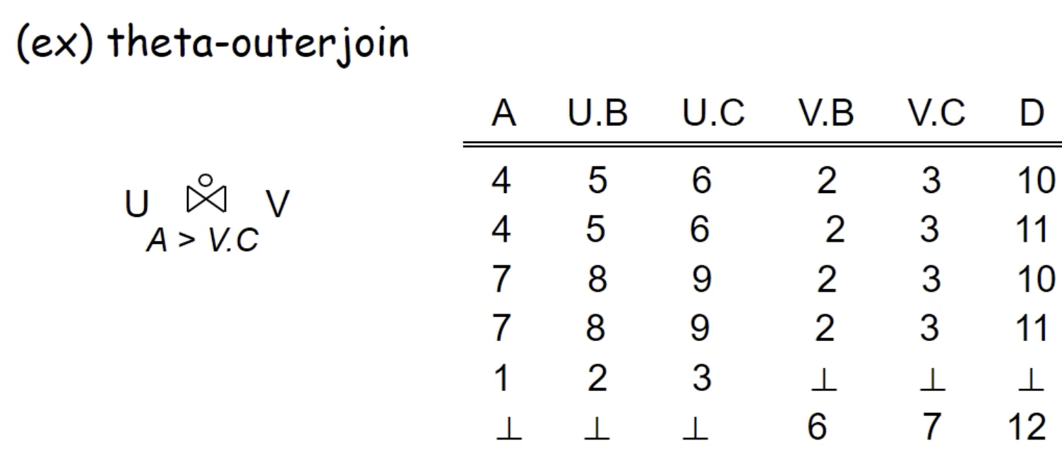 - Theta-outerjoin : Theta join의 outerjoin 버전으로, 기호 하단에 조건을 작성하는 형태임. NULL일 경우에는 조건을 따지지 않고 그대로 표기