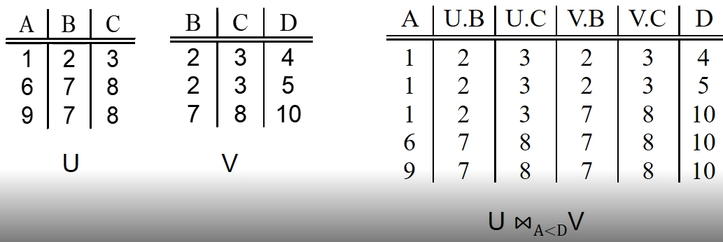 - Natural Join과 달리, 두 속성값이 같지 않은 경우도 고려될 수 있음