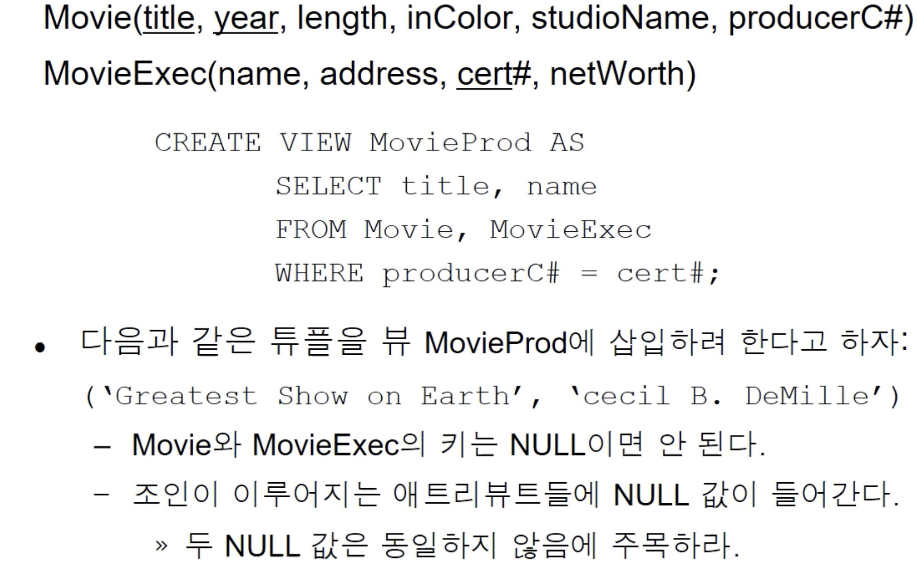 - Key Attribute들은 NULL이 아니어야 한다. 아래 예시에서는 View에 삽입되는 튜플이 Join의 기준 attribute인 producerC#, cert#을 포함하지 않기 때문에 문제가 발생한다.