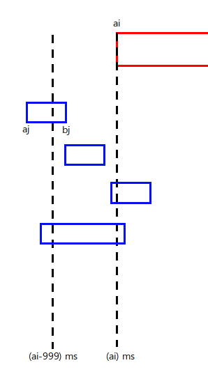요청 i의 왼쪽점 기준으로 요청 i와 요청 j가 1초 간격 내에 포함되는 경우는 다음과 같다.