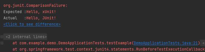 assertEquals("Hello, xUnit!", message); //false