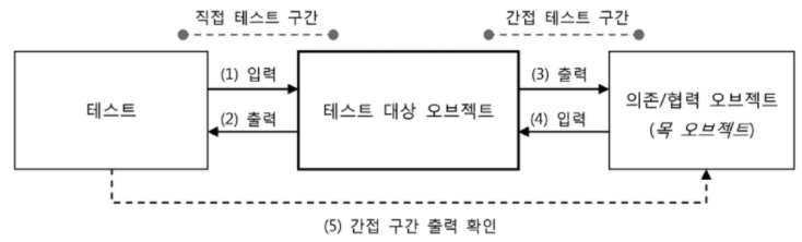 - 테스트 대상 오브젝트의 의존 객체로 존재하면서 테스트를 돕는다는 점은 테스트 스텁과 유사하지만, 테스트 대상 오브젝트가 의존 오브젝트에 넘기는 값과 그 행위 자체에 대해서도 검증할 수 있는 객체다.