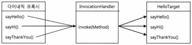 - InvocationHandler에 타깃 오브젝트를 저장해두고, invoke() 메소드에 타깃 오브젝트에 실행할 메소드와 파라미터를 넘기면 된다.