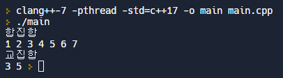 C++의 set에는 중복을 허용하지 않는 set, 중복을 허용하는 multiset을 지원하며, 이들을 이용하여 두 벡터의 합집합과 교집합을 구해볼 것이다.