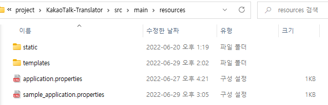그리고 commit 하고 싶지 않은 파일인 application.properties는 다음과 같은 경로에 저장되어 있다.