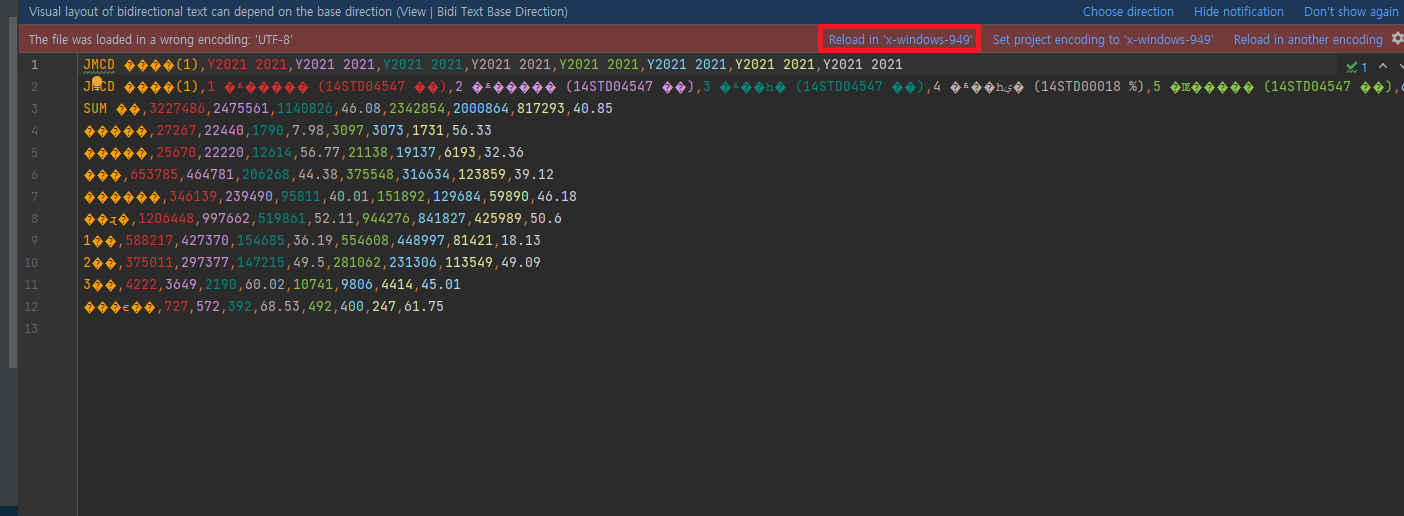 프로젝트에서 csv 파일을 추가하는 과정에서 다음과 같이 한글이 깨져있는 것을 확인했다.