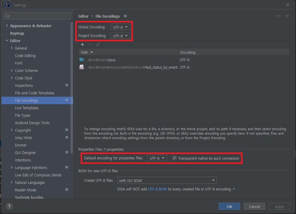 참고로, 개발 초기에 IntelliJ 에디터의 파일 인코딩과 VM을 UTF-8로 미리 설정해주는 것이 좋은 습관이다.