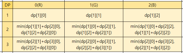 즉 n번째 집까지 칠했을 때 n번째 집이 R이라면 비용의 최솟값은 n-1번째 집이 G색일경우의 총 비용의 최솟값과 n-1번째 집이 B색일경우의 총 비용의 최솟값중 더 작은 값.