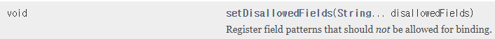 - DataBinder.setDisAllowedFields() 메소드로 바인딩을 금지할 필드 목록을 지정할 수 있으며, 해당 목록 외의 모든 요청 파라미터는 다 허용한다.