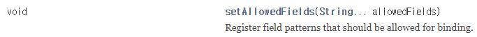 - DataBinder.setAllowedFields() 메소드로 바인딩을 허용할 필드 목록을 지정할 수 있으며, 해당 목록 외의 모든 요청 파라미터는 다 무시한다.