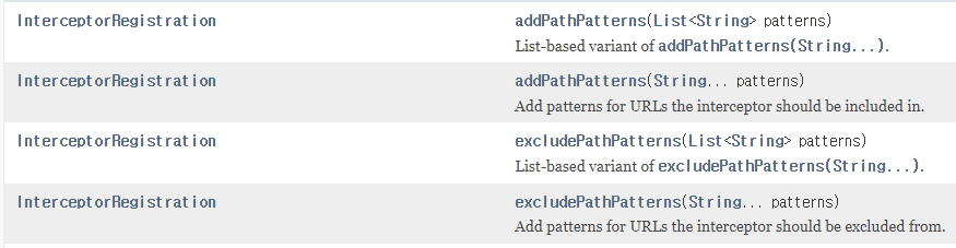 - 특정 URL 패턴에 대한 요청에만 인터셉터를 적용하려면 addPathPatterns() 메소드를 붙여서 URL 패턴을 지정해주면 된다. 물론 addWebRequestInterceptor() 메소드의 뒤에도 연결 가능하다.