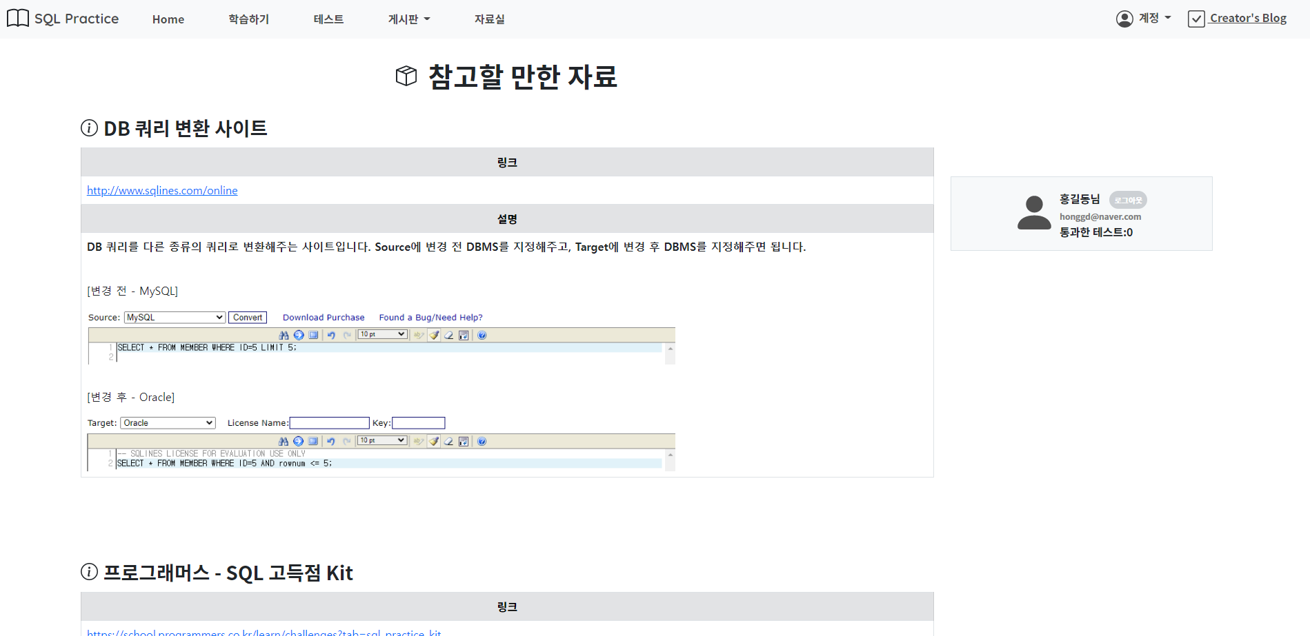 - DB 쿼리 변환 사이트, 프로그래머스 SQL 고득점 Kit 등 SQL 학습에 도움이 될 만한 자료를 공유