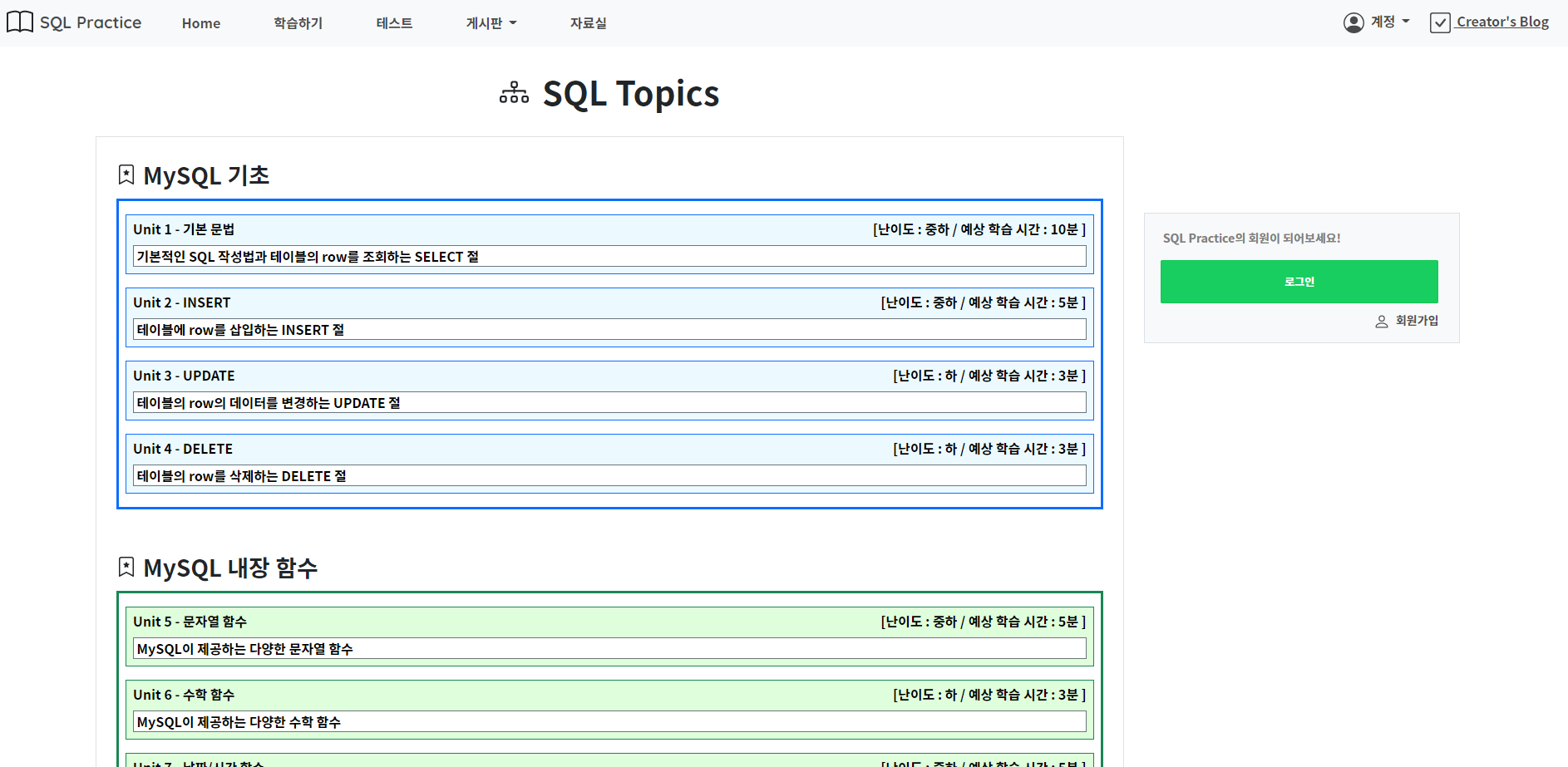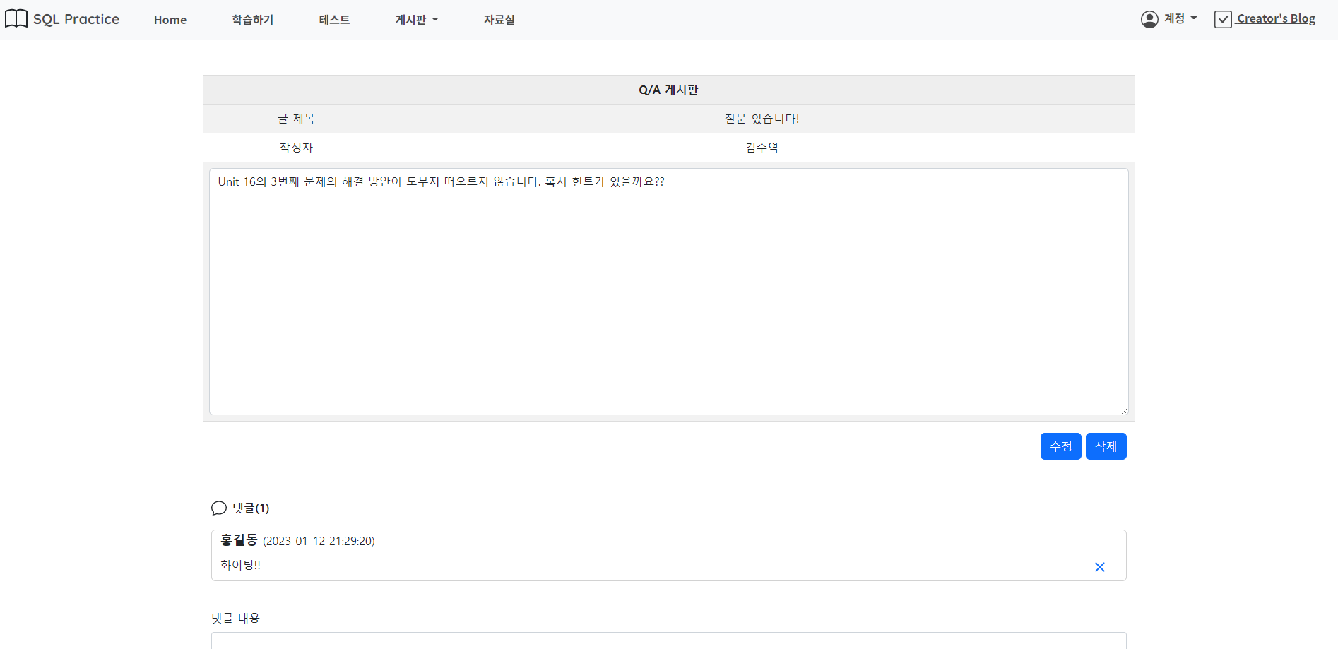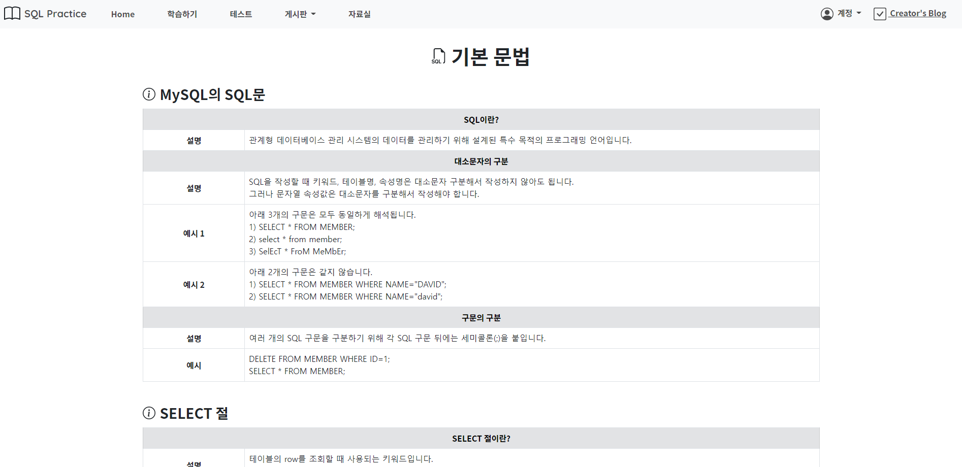 - 프로젝트 설명 : SQL 입문자들에게 SQL의 기본 문법부터 다중 테이블 연산까지의 내용을 교육시켜주고 학습 테스트 및 Q&A 게시판을 제공한다.