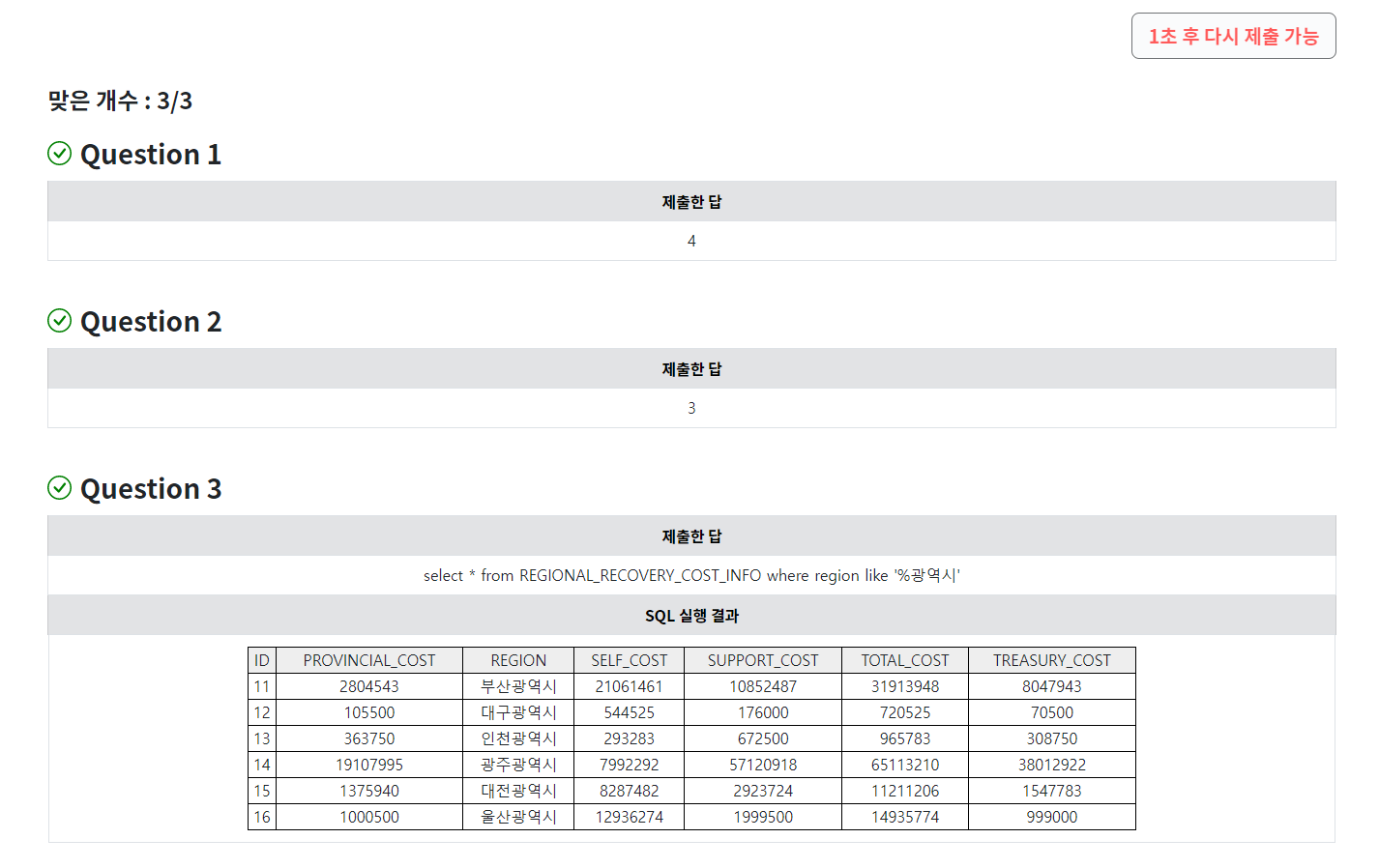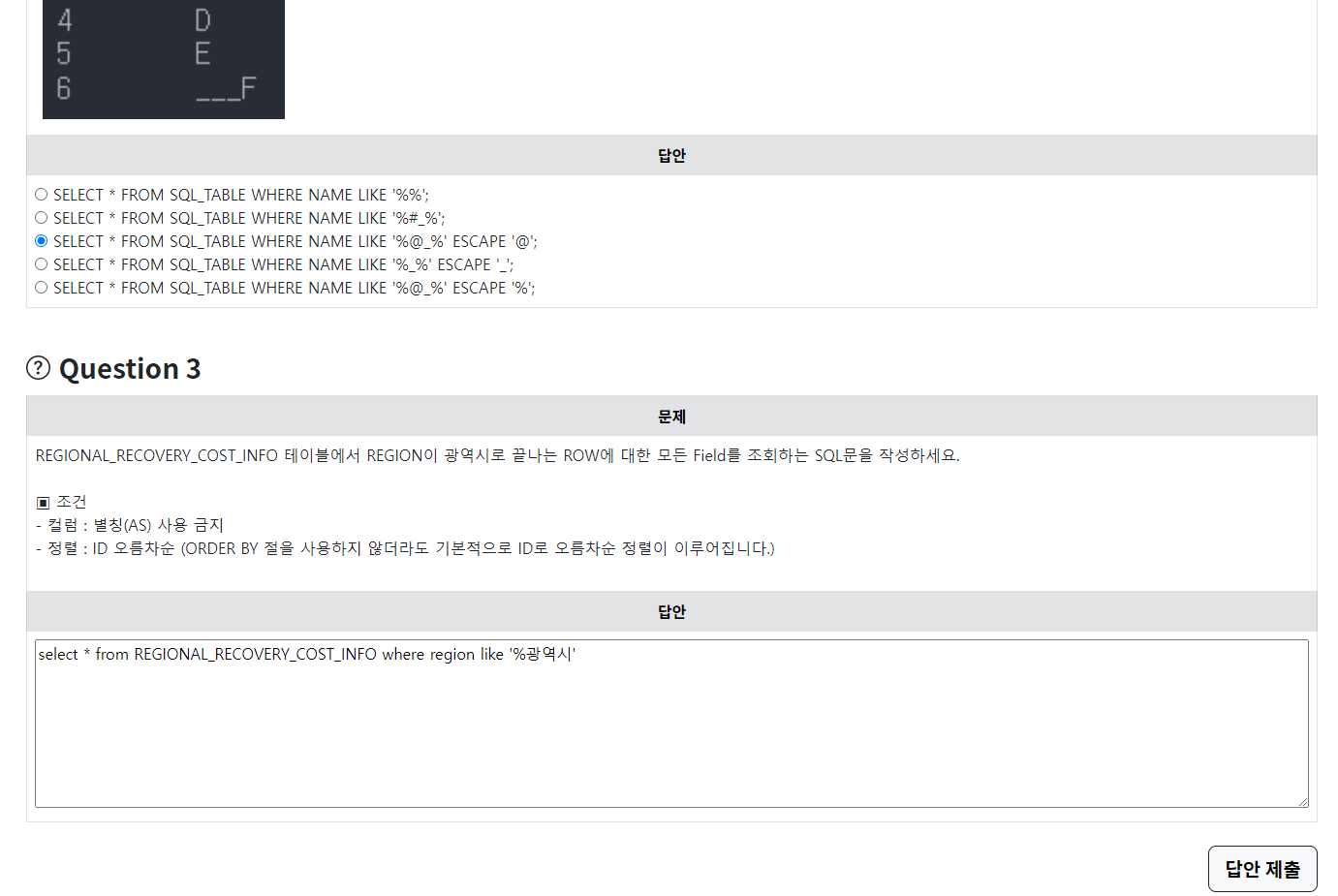 - 사용자에게 받은 주관식(SQL) 답안의 경우에는 금지 키워드(DROP, DELETE, UPDATE 등)가 포함되어 있는지를 검증하고, 사용자가 작성한 SQL문을 Mybatis으로 실행하여 가져온 결과를 채점함