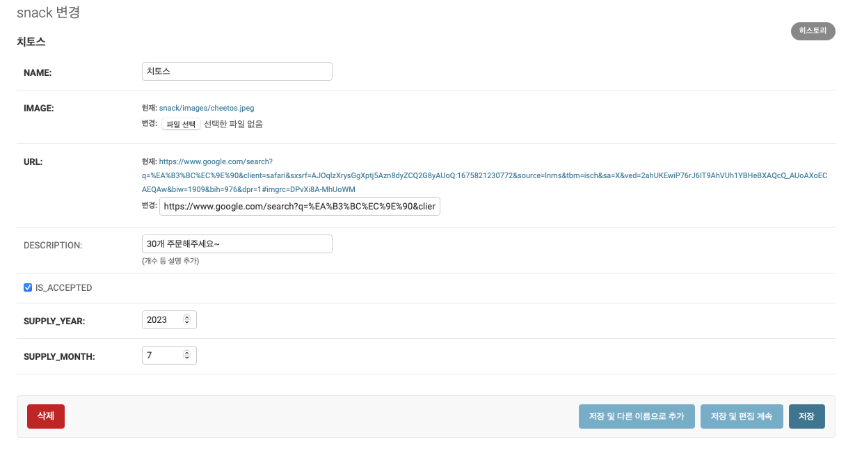 - 비치 예정 날짜를 변경할 수 있도록 supply_year, supply_month 속성을 SnackAdmin 클래스의 list_display 목록에 추가했다. admin.py 소스코드는 2)에 첨부했다.