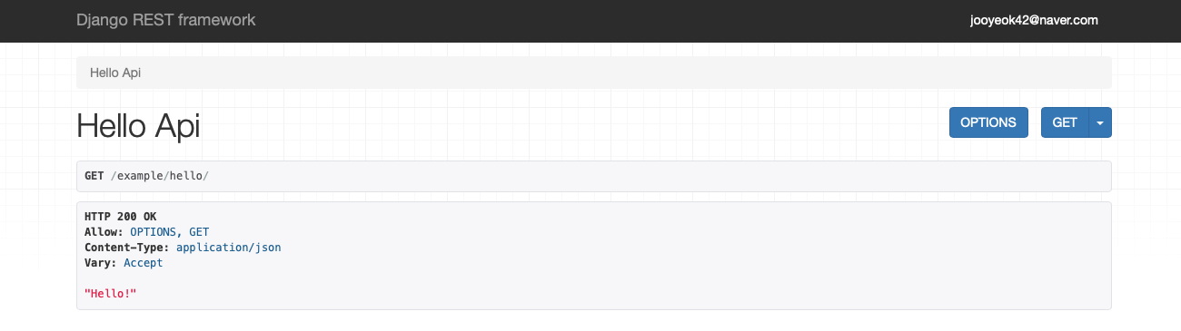 - example이라는 앱을 만들고 example/urls.py에 HelloAPI라는 간단한 뷰 하나를 작성해볼 것이다. @api_view 데코레이터를 통해 HelloAPI라는 뷰 함수가 GET 요청을 받을 수 있는 API라고 명시해줬다.