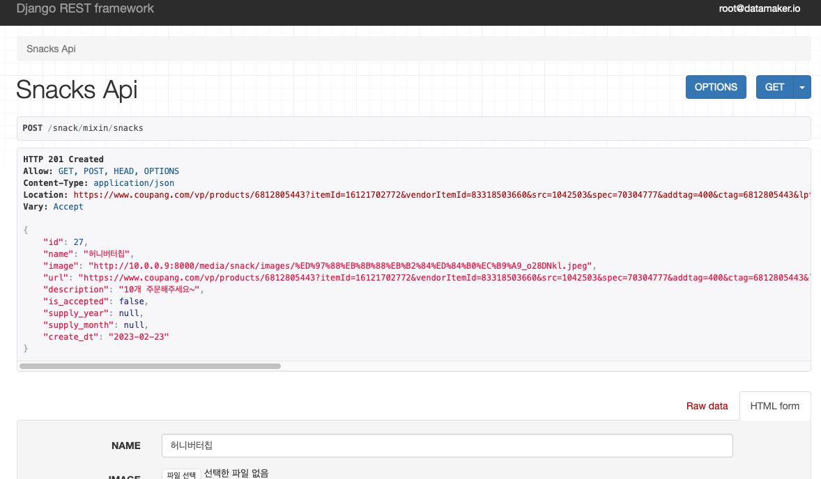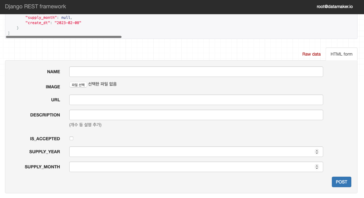 스크롤을 아래로 내려보면 HTML 폼이 나타날텐데, 이 폼은 믹스인이 제공해준 것이다. 이 곳에 원하는 데이터를 입력하고 POST를 누르면 된다.