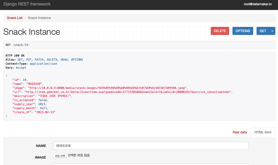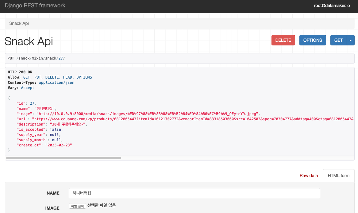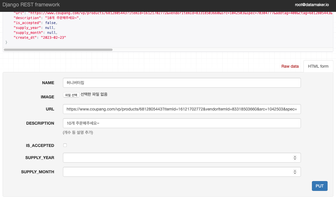 그 다음은 retrieve 기능과 update 기능이다. 바로 위에 첨부한 POST 요청 성공 화면과 동일한 화면이 나올 것이다. 해당 모델 객체의 데이터가 폼에 채워져 있으며, 수정이 필요하다면 내용을 바꾸고 PUT 버튼을 누르면 된다.