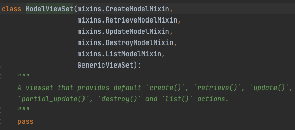viewsets.ModelViewSet의 내부를 보면, 이 5가지 기능을 각각 담당하는 믹스인 클래스들을 모두 가지고 있는 모습이다.