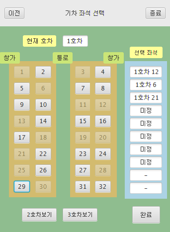 | 7. 기차 좌석 선택 - 1호차  | 2호차  | 3호차  |