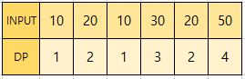 만약 현재 INPUT값이 30이라면 이전 INPUT값들은 각각 10, 20, 10이고, 이들의 각 DP값은 1,2,1이다.