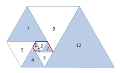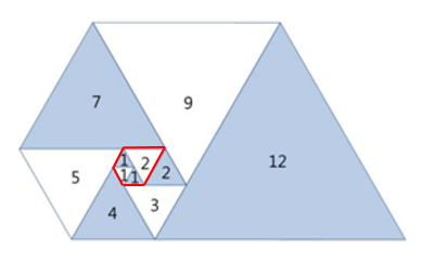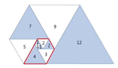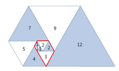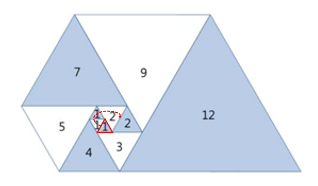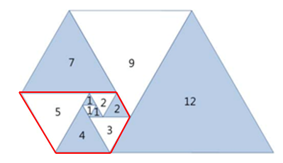 기준이 되는 첫 삼각형은 크기가 1인 정삼각형이라고 했는데, 아래에 빨간 테두리로 쳐 둔 정삼각형이 기준인 것 같다.