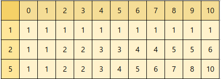 동전 i(1≤i≤n)개를 쓰며, j(0≤j≤10) 원을 만드는 모든 경우에 대해 DP를 수행해주면 된다.