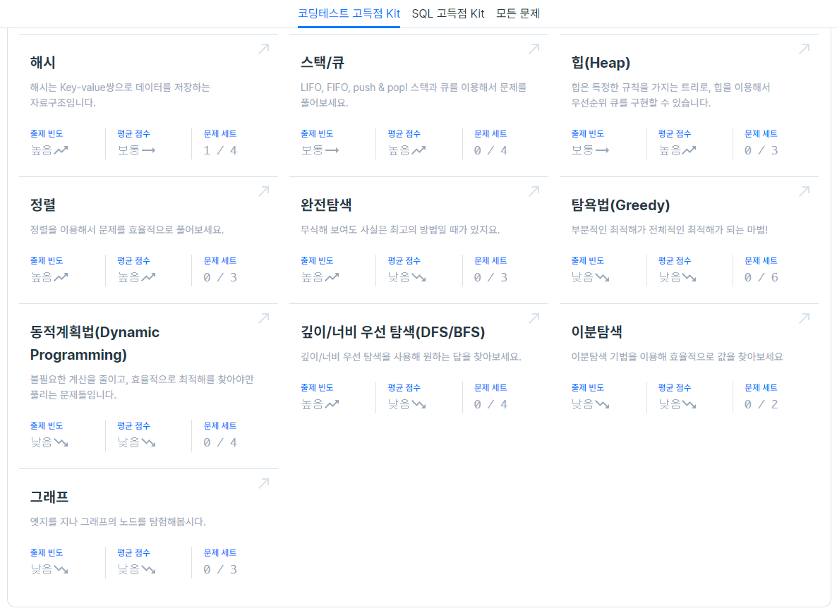 코딩테스트 고득점 Kit에는 여러 알고리즘별로 2~6문제 씩 총 36문제가 있다.