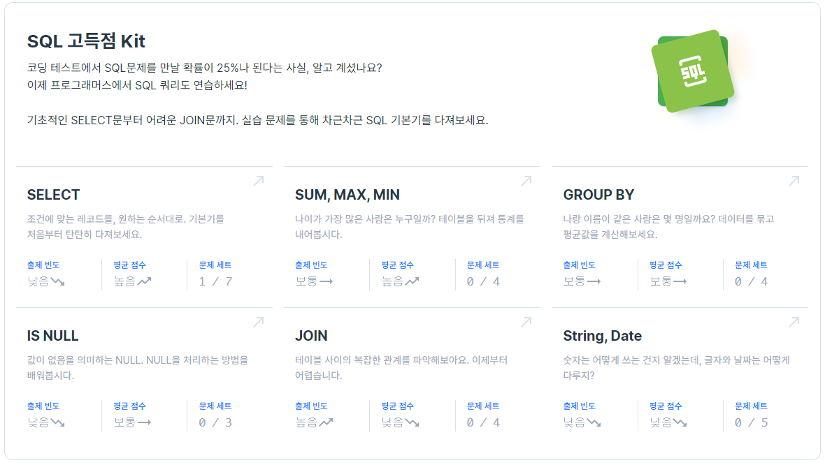 SQL 고득점 Kit에는 여러 문법 별로 3~7문제 씩 총 27문제가 있다.