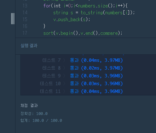 compare 함수에서 return을 b+a<a+b 로 해주고,